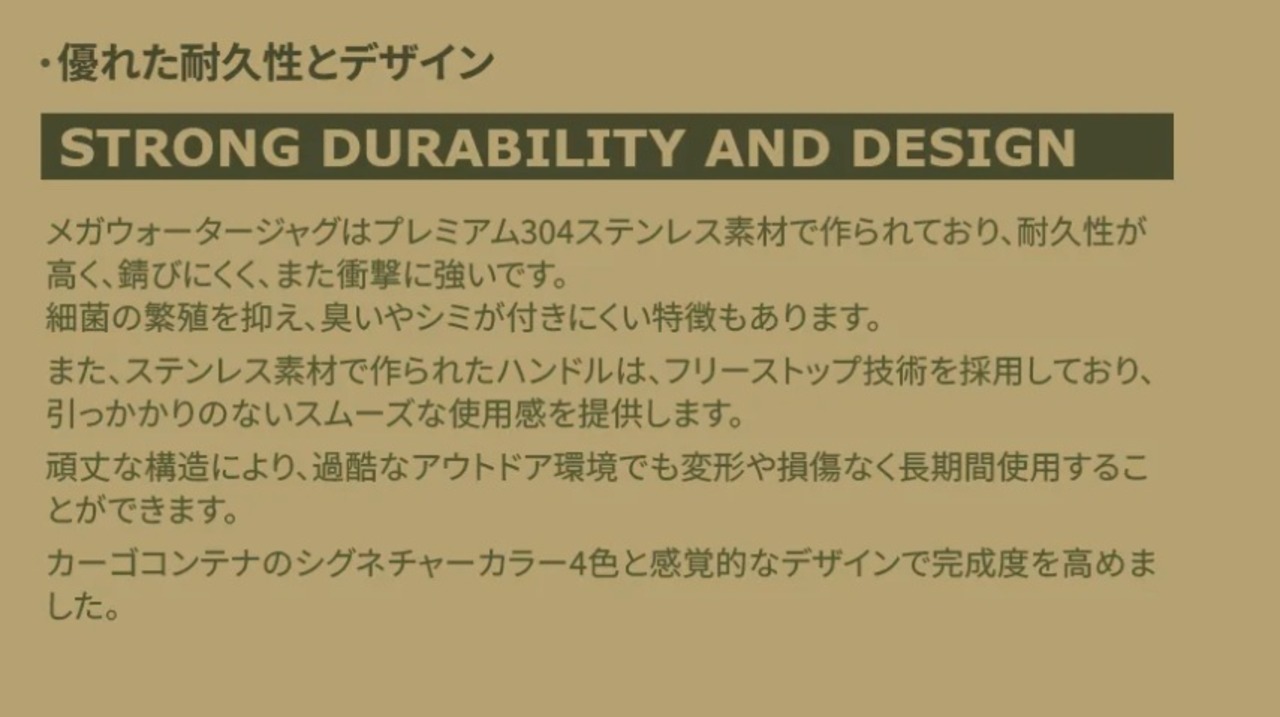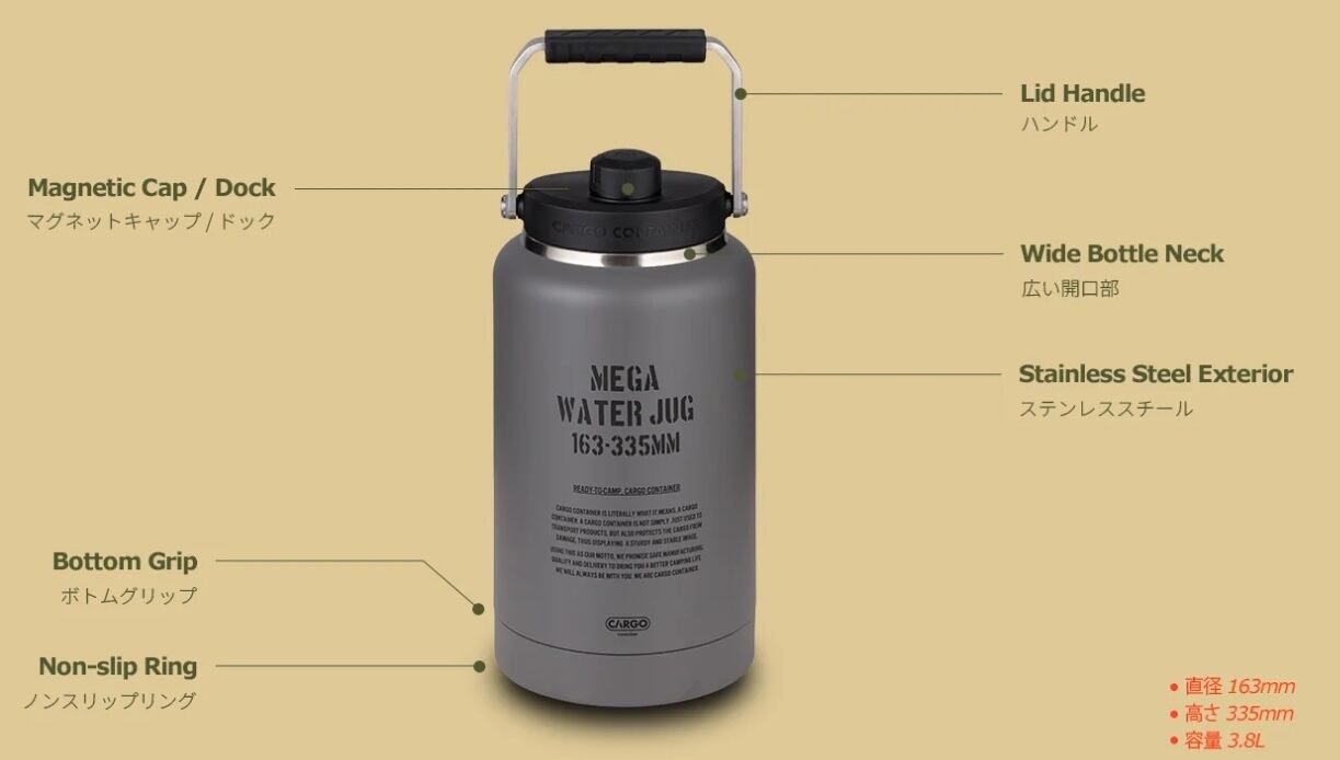 メガウォータージャグは、カーゴコンテナが独自に設計し、開発した大容量3.8Lのプレミアムウォータージャグです。
