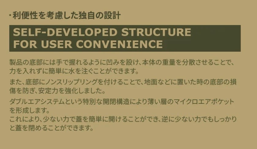 ダブルエアシステムという特別な開閉構造は薄い層のマイクロエアポケットを形成し、少ない力で簡単に開閉ができます。
