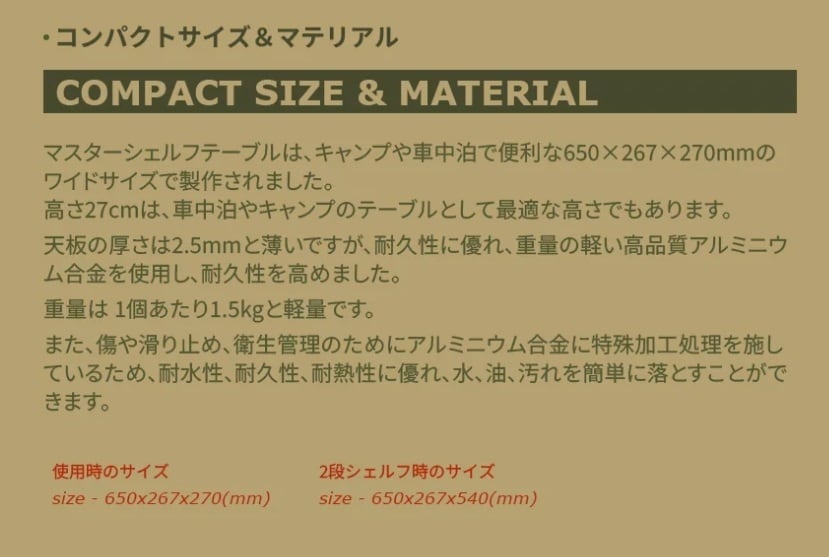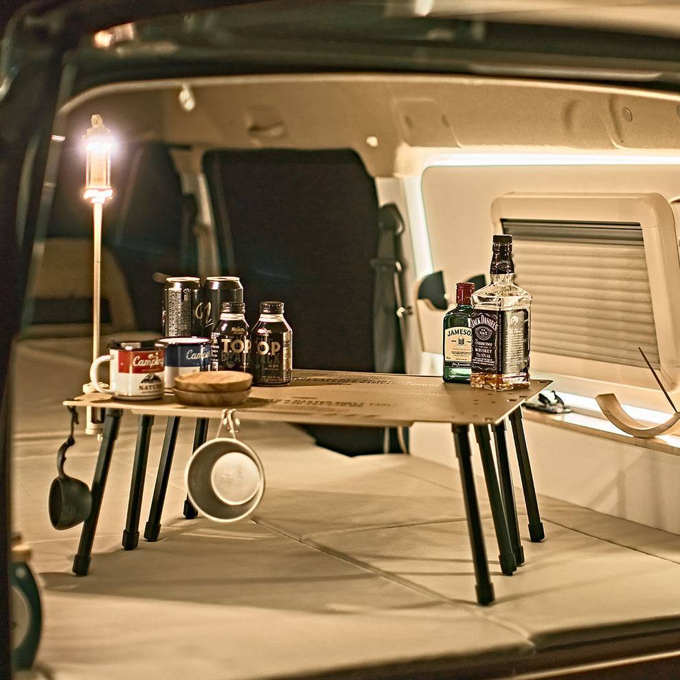 車中泊テーブルおよびシェルフとして特化したマスターシェルフテーブルは、キャンプユーザーのスタイルに応じて様々な方法で使用可能です。