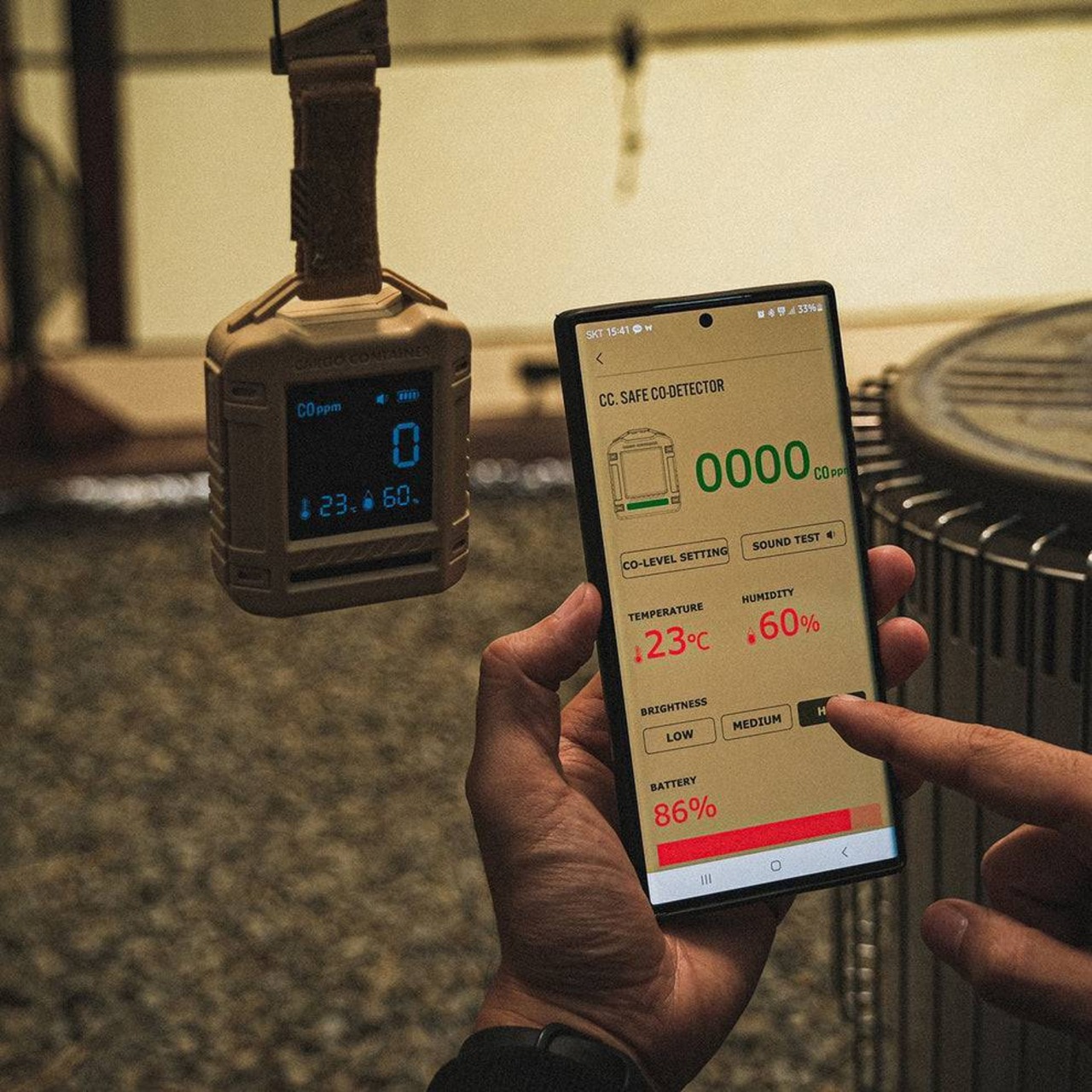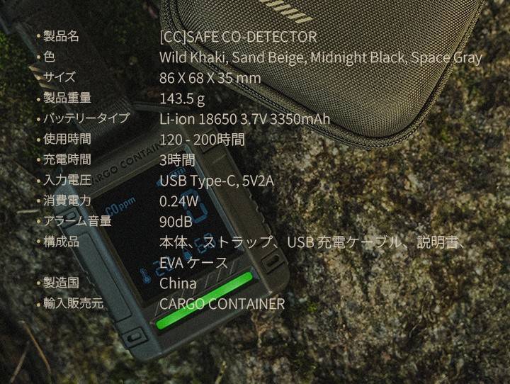 キャンプや車中泊での一酸化炭素中毒リスクを知らせる、ポータブル一酸化炭素検知器。