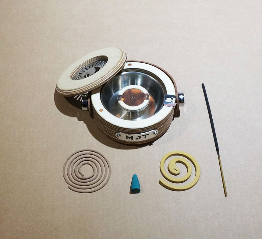 元々電子機器のデザイナーが手掛けた蚊取り線香ホルダー上質なスピーカーから音が出るように煙が出ることをイメージしました。