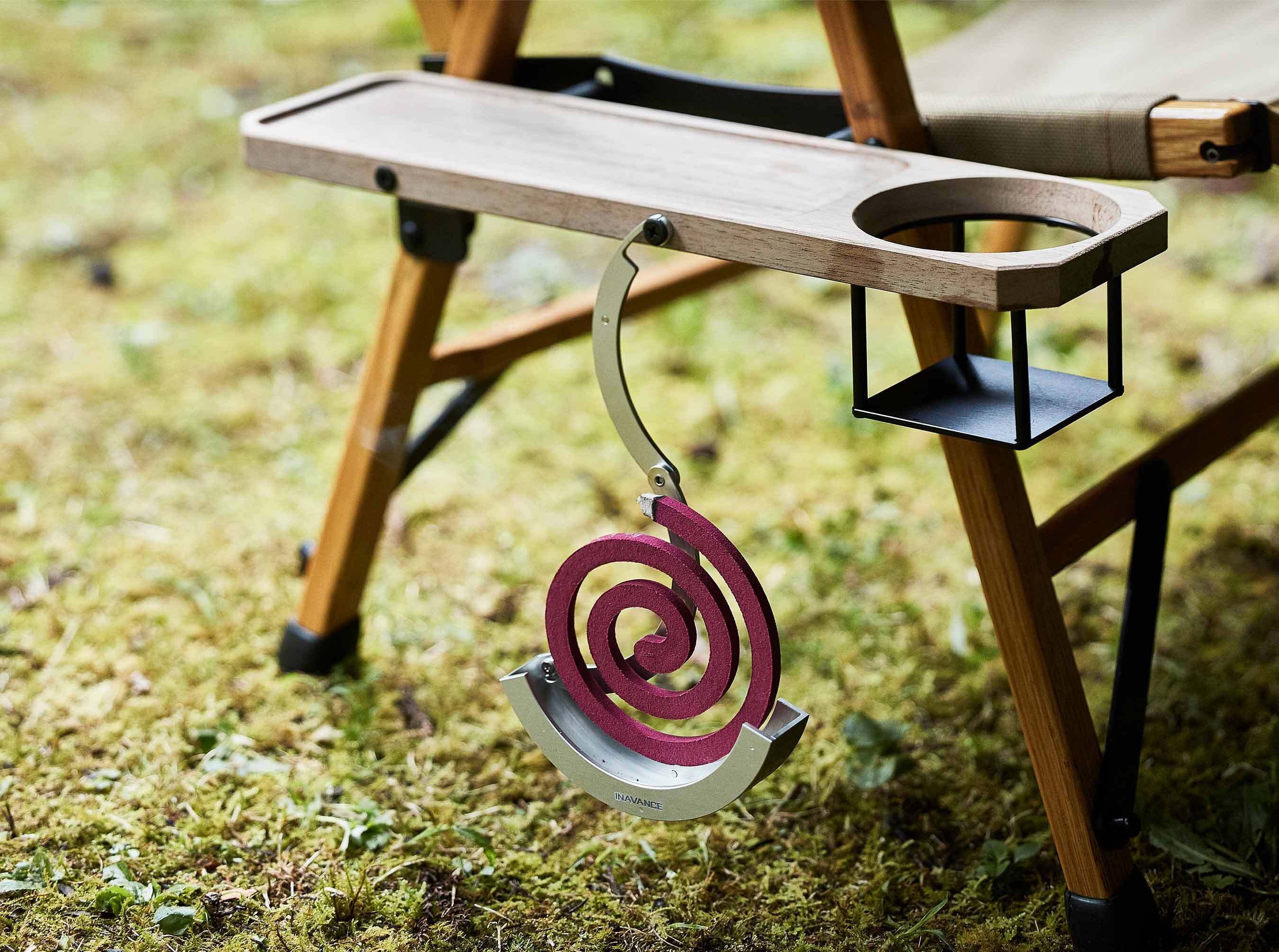 三日月の形をしたアルミ削り出しの蚊取り線香ホルダー、インアバンス「MIKADZUKI(ミカヅキ)」。 キャンプシーンに欠かせない渦巻き型の蚊取り線香を主役としたプロダクトにしようと 趣向を凝らし完成した製品です。吊るしての設置とスタンドでの設置が可能で、どちらのパターンもデザイン性を損なわず、かつ「軽量・コンパクト・便利」という機能性も重視。 底面に施した穴を利用して、三脚にも装着できます。 基本的に灰は本体内に落ちる設計ですが、外れる可能性もございますので、アウトドアでの使用をおすすめしています。