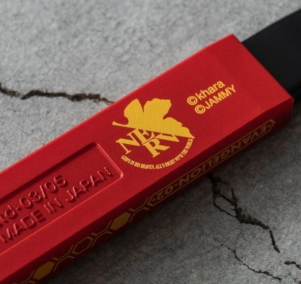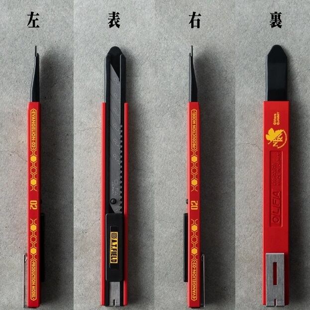 劇中に登場する機体をモチーフにしたカラーリングに、機体名称表記やハニカムパターンなどのエヴァンゲリオンらしいメカニカルなあしらいを組み合わせたデザインのカッターナイフです。本体樹脂部分はタフなイメージのマットカラー塗装を、金属のブレードホルダー部分には鈍く輝く美しさが特徴的なセミグロスブラック焼付塗装仕上げをそれぞれ施した質感の高いアイテムです。