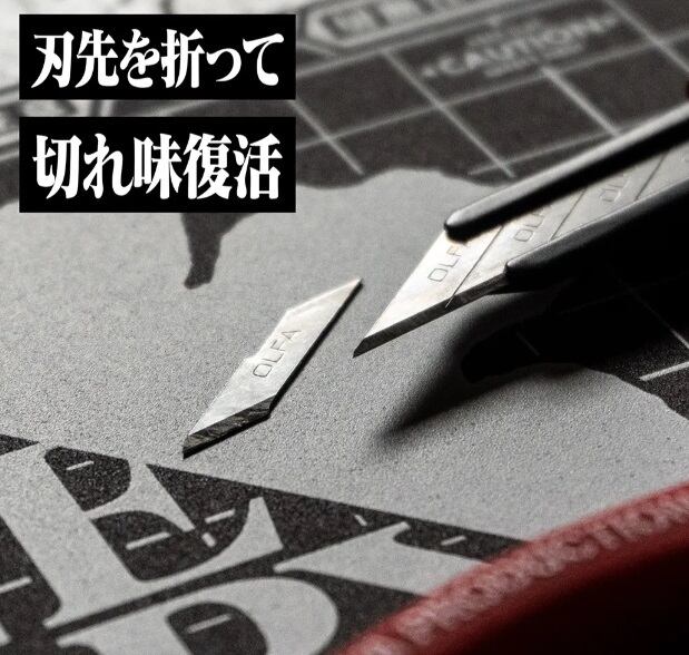 切れ味が落ちたら刃先を折ることができるオルファ式刃を採用。折れた部分が新しい刃先となることで、鋭い切れ味が持続します(オルファ製のカッター替刃に対応)。