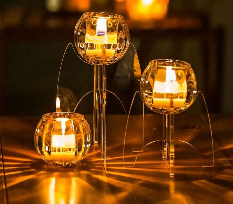 まるでグラスが空中に浮かんでいるように見え、あかりとあかりが交わり、揺れる様子をゆっくりと眺めたくなるアイテムです。
